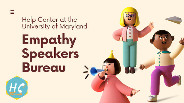 Request an Empathy and Helping Skills Workshop from the Help Center!The Help Center at UMD is launching a new program called the Empathy Speaker’s Bureau! The Empathy Speaker’s Bureau is a program where campus groups can request a workshop covering empathy and basic helping skills to be presented by trained volunteers.The three aims of the hour-long presentation are:To increase awareness of empathy and the ways it manifests in communication